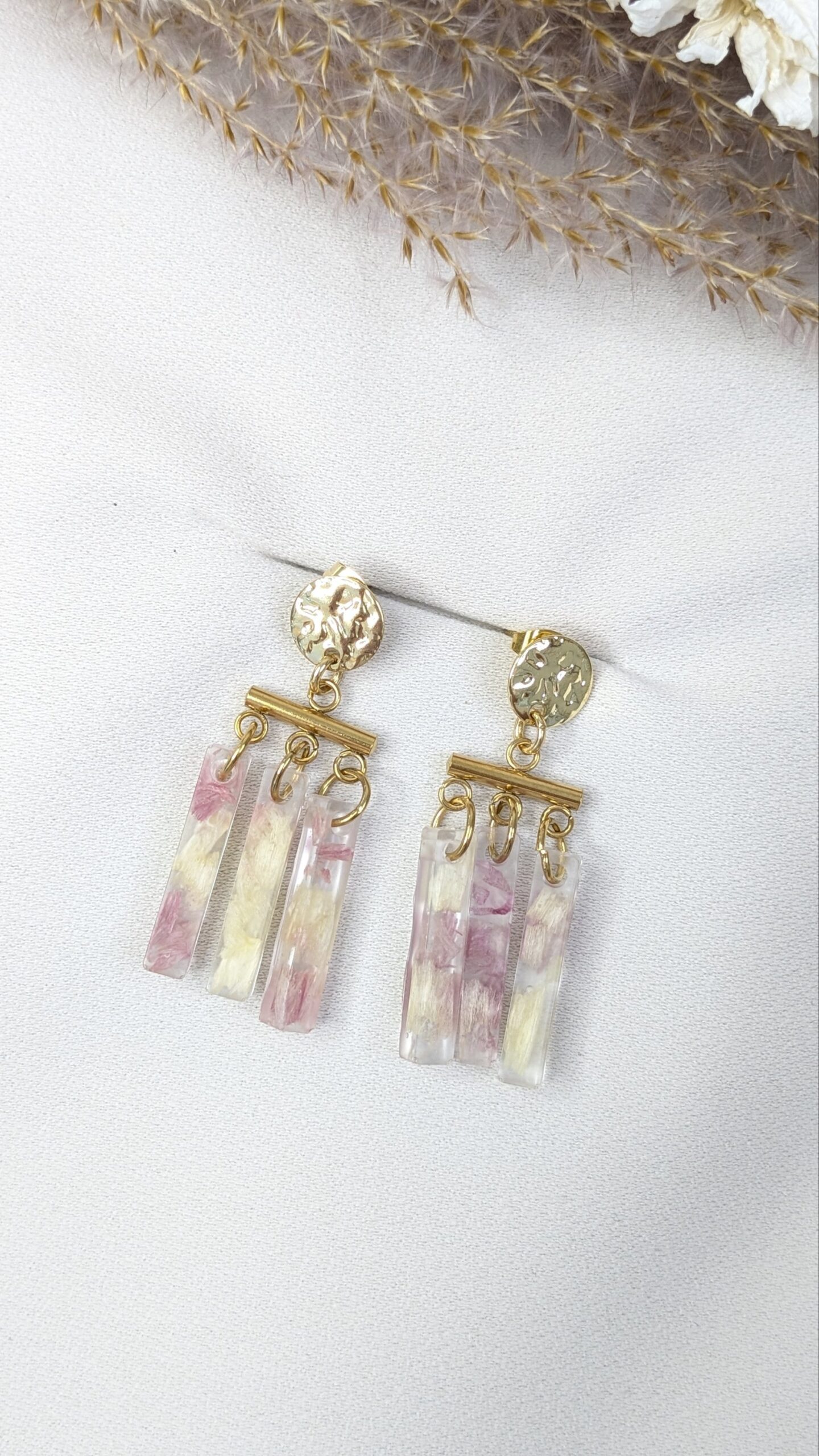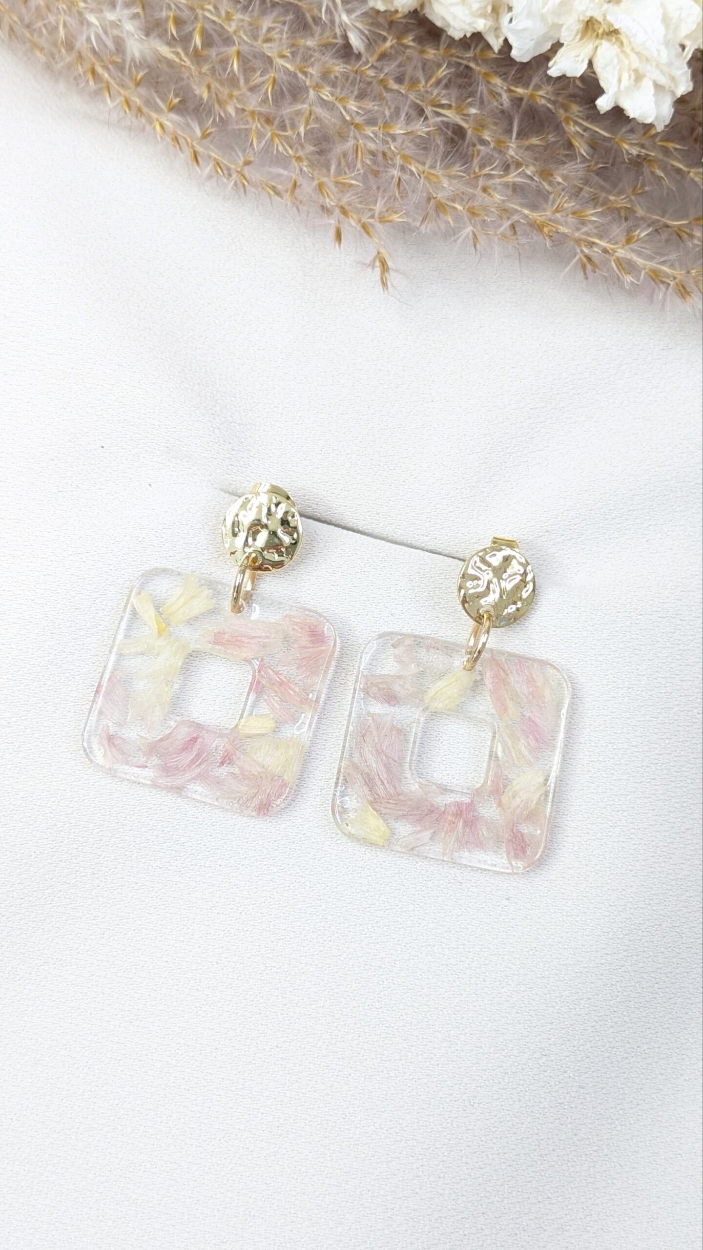 Boucles d’oreilles en fleurs séchées issues de mon jardin, montées à la main dans une résine transparente. Chaque modèle est unique, inspiré de la nature et des saisons.