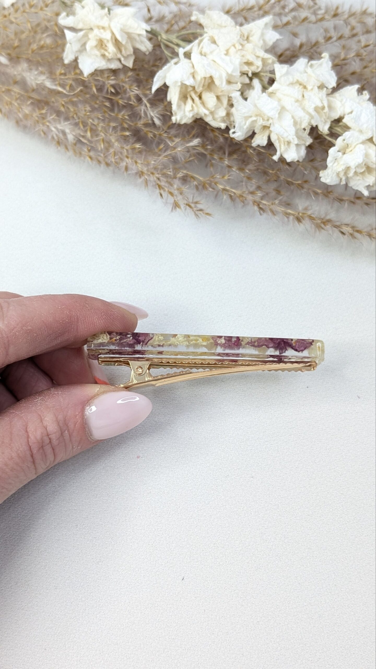 Chaque bijou est conçu à partir de véritables fleurs séchées cultivées et récoltées dans mon jardin, puis soigneusement intégrées dans la résine pour capturer leur beauté naturelle.