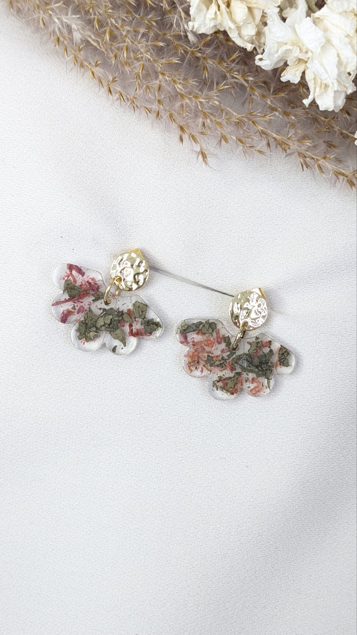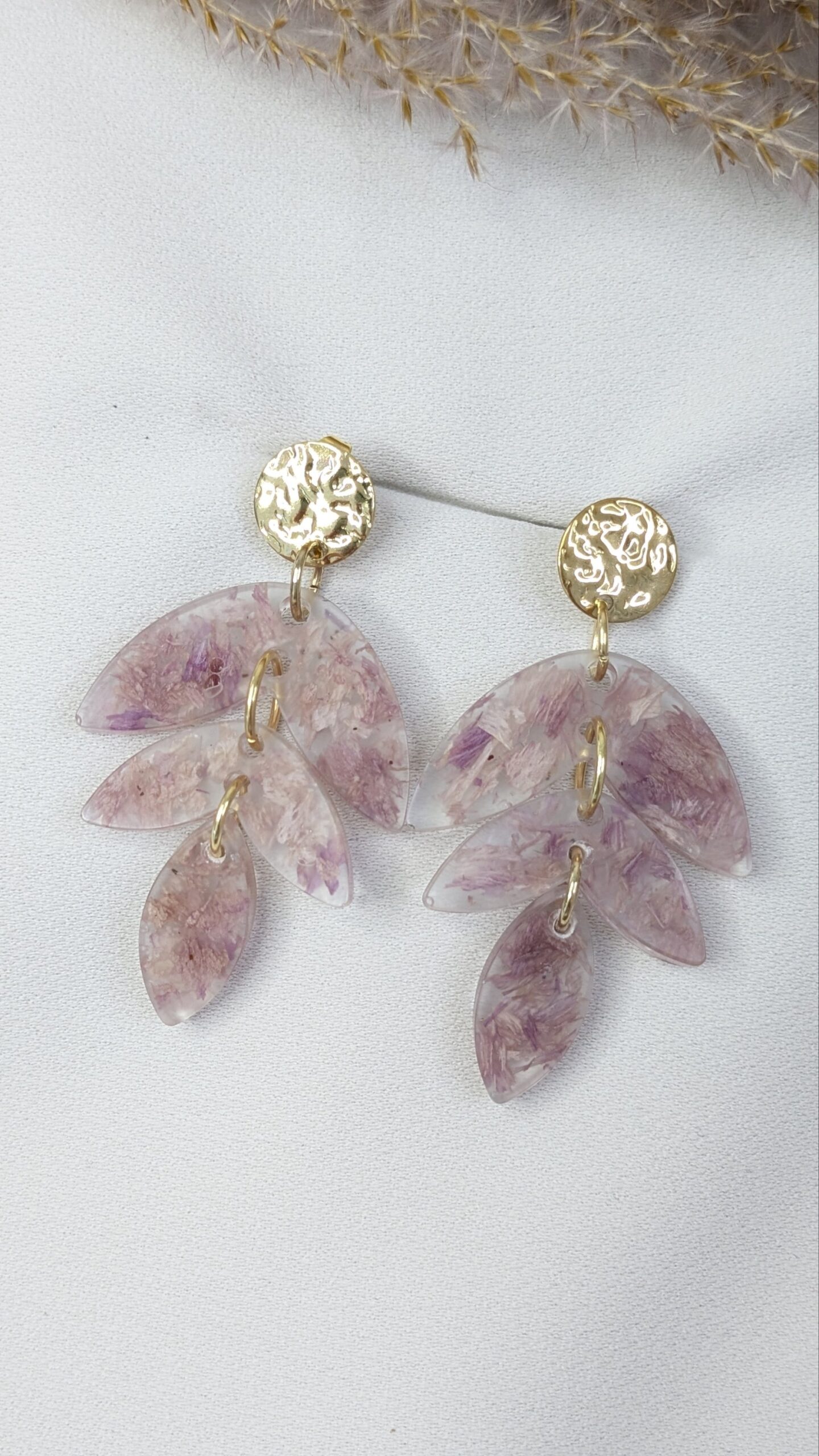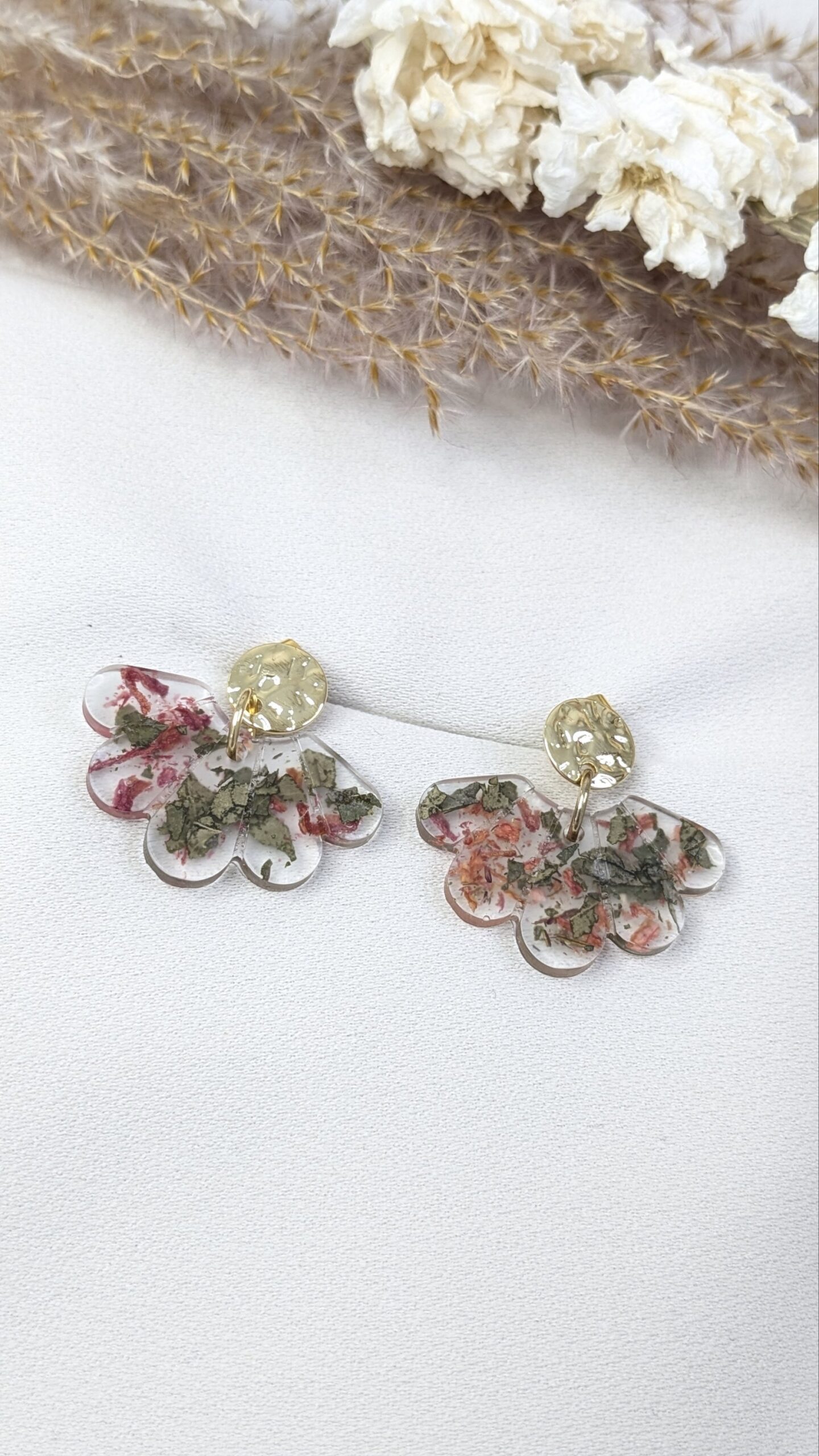 Boucles d’oreilles en fleurs séchées issues de mon jardin, montées à la main dans une résine transparente. Chaque modèle est unique, inspiré de la nature et des saisons.